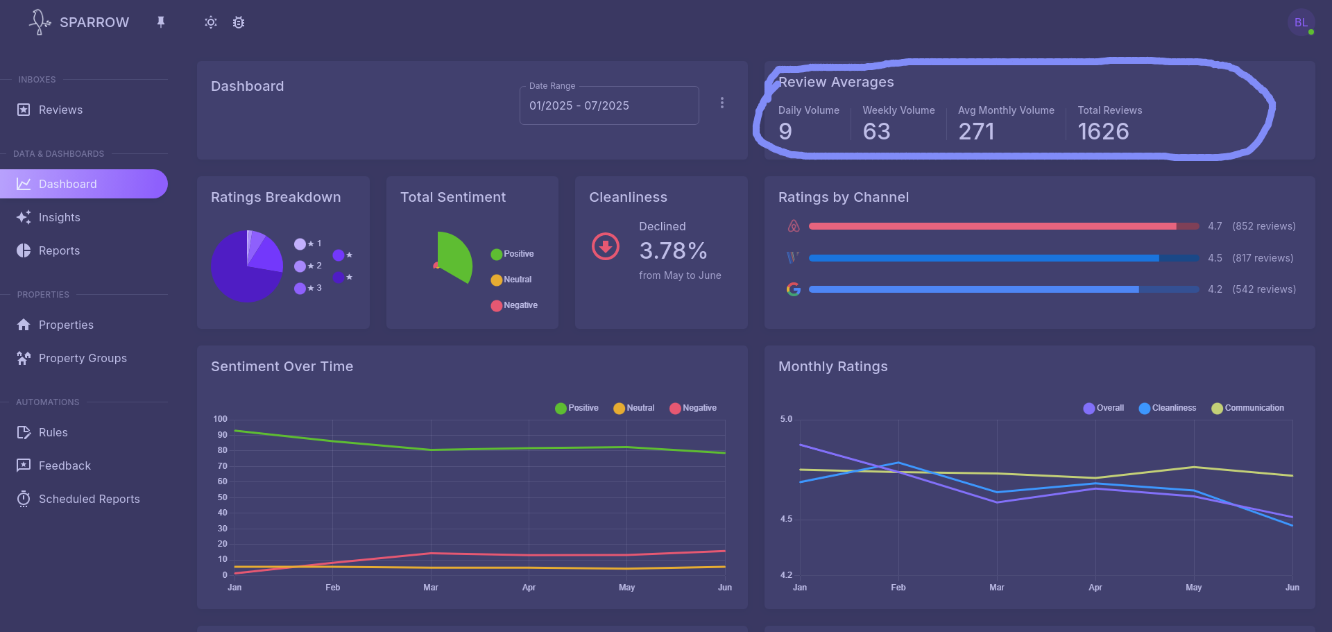 On the main dashboard, it would be fantastic to have the overall average review score as part of the “overall averages” portion at the top of the screen.