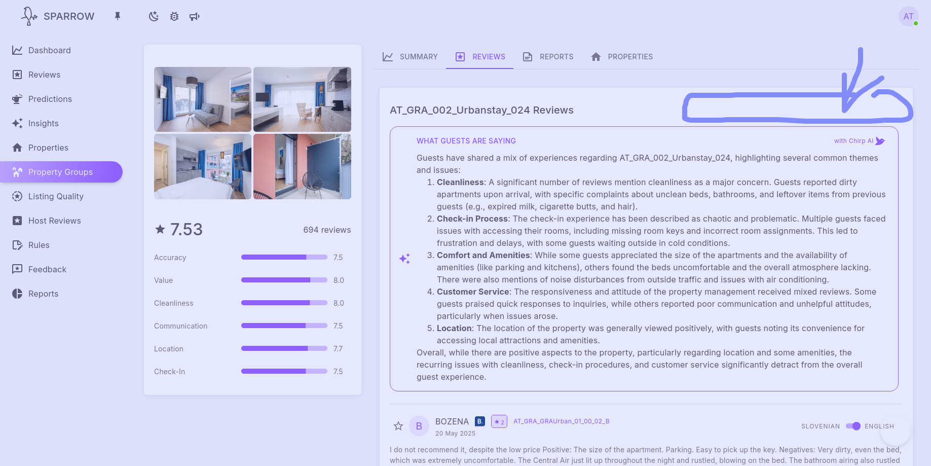 While trying to check the insights of a property group and entering into a specific one, there is no time frame specified but the alogorithm prioritises the most recent reviews. It would be great to include a time frame here too, to have more control of the content and check the impact of specific initiatives on a group level.